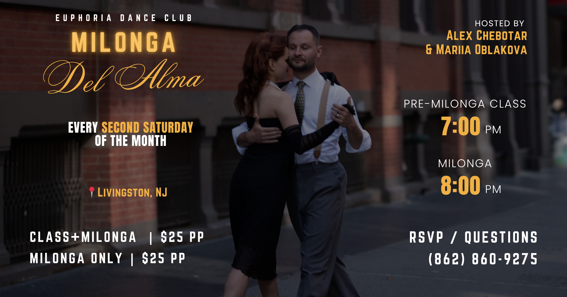 Upcoming milongas May 9th Saturday, May 9, 2026 "Milonga Del Alma" Performers: Mariia & Alex Euphoria Dance Club 105 E Northfield Rd, Livingston, NJ 07039 June 13th Saturday, June 13, 2026 "Milonga Del Alma" Performers: Rainier Pereira & Sonya Tsekanovsky Euphoria Dance Club 105 E Northfield Rd, Livingston, NJ 07039 July 11th Saturday, July 11, 2026 "Milonga Del Alma" Euphoria Dance Club 105 E Northfield Rd, Livingston, NJ 07039 August 8th Saturday, August 8, 2026 "Milonga Del Alma" Euphoria Dance Club 105 E Northfield Rd, Livingston, NJ 07039 Text For Booking (862) 860-9275 Email Us euphoriadanceclub@yahoo.com Our Location 105 E Northfield Rd,Livingston, NJ07039