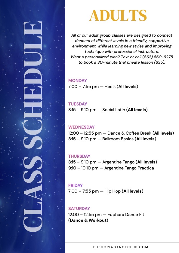 We offer a wide variety of dance styles — from ballroom and Latin to hip hop, heels, fitness classes, and social dances. Our programs cover many levels and interests, so every student can find the perfect style to fall in love with.